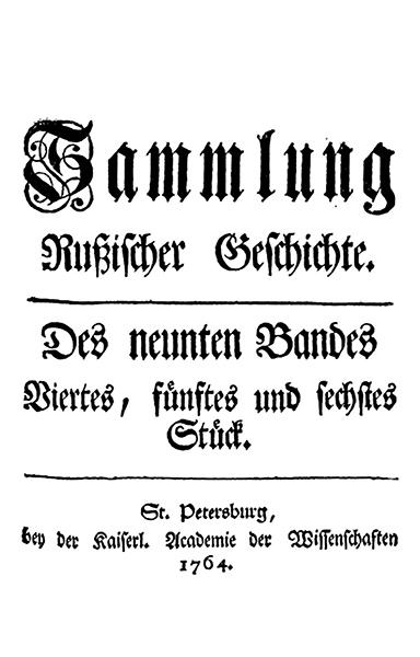 Самым популярным был, несомненно, издававшийся в Петербургской Академии наук в 1732–1764 гг. Г. Ф. Миллером «знаменитый», по словам русского историка Сергея Михайловича Соловьева, исторический журнал/сборник «Sammlung russischer Geschichte» («Собрание Российской истории»)10.