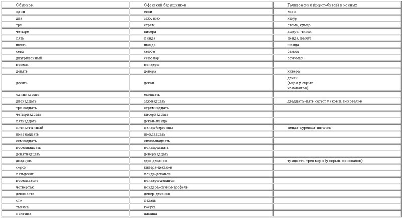 У офеней гривенник — марошник, у мазуриков — жирманник; у офеней полтина — ламиха, у конных барышников — дер; четвертак у барышников — секана, секис, у мазуриков столичных — жирма-беш, у коновалов — хруст; целковый у коновалов, например, скрыпенских — седой, у конных ярмарочных и столичных барышников — бирс. Сто у офеней — пе-халь, по музыке — капчук; день у офеней — бендюк, у шерстобитов — волгаж. У офеней петух — ворыхан, у шерстобитов, например, кинешемских — гогус; кровь у офеней — вохра и кира, у шерстобитов — кан; грива у офеней — маруха, у мазуриков — трешка, у барышников — жирмаха; рука у офеней — хирьга, у мазуриков — граблюха, у шерстобитов — бира; штаны у офеней — шпыни, у сибирских шерстобитов — чинары, у мазуриков — шкеры и проч. Вот несколько слов шерстобитов (из языка так называемого кантюжного): самовар — беззаботный, жеребец — агер, давать — дякать, ямщик — шмляк, веник — било, два — кокур, пила — зубила, колокол — звонарь, зубы — жоры и жор, колемить, заколемить — захворать, овца — басаргуля, скоро — башково, кукушка — гадайка, пирог — елесник и проч. Несколько слов скрыпенских коновалов; клева, неклева (общее), съюхтить — получить доход, схизнуть — бранить, бакулить — говорить, облобызать — своротить с дороги для разговора, сак — сюда, ламашник — полтинник (общее). Счет их указан дальше.[110]