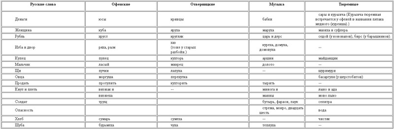 По сличении всех этих искусственных языков одного с другим нельзя не заметить общего всеми стремления встать в независимость, отделиться для самостоятельного существования. Цель достигнута. Оттого-то не только трудно, но и почти невозможно узнать и доискаться теперь до корня, до тех прадедов, от которых выродились позднейшие многоколенные семейства; черты сходства остались неясными и немногочисленными. Вот и примеры: прежде всего наталкиваемся на того неизменного друга, для которого у русских людей придуманы целые десятки слов и прозваний, от нежных ласкательных до грубых ругательных, какова водка, вино. У офеней она зовется гамза, гамзыра и дрябка; в отверницкой речи известна под именем ардимахи; в мазурницкой музыке зовется канка и кановка; на арестантском языке в тюрьмах — хамло; у скрыпенских коновалов — ло-фейка; старинные разбойники называли ее — товаром из безумного ряда. Роковое место — тюрьма, прозванная офенями качуха, у специалистов-арестантов называется: у сибирских — чижовка, у русских — кучумка и в более строгом смысле у каторжных арестантов (военных) — палочная академия. Древние разбойники звали ее "каменный мешок".