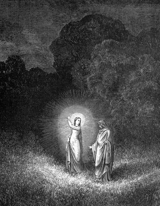 Содержание. Уклонившись в глубоком сне с прямой дороги, Данте пробуждается в темном лесу, при слабом мерцании месяца идет далее и, перед дневным рассветом, достигает подошвы холма, которого вершина освещена восходящим солнцем. Отдохнув от усталости, поэт восходит на холм; но три чудовища — Барс с пестрою шкурою, голодный Лев и тощая Волчица, преграждают ему дорогу. Последняя до того устрашает Данта, что он уже готов возвратиться в лес, как внезапно появляется тень Виргилия. Данте умоляет ее о помощи. Виргилий, в утешение ему, предсказывает, что Волчица, там его испугавшая, скоро погибнет от Пса, и, для выведения его из темного леса, предлагает ему себя в вожатые в странствии его через Ад и Чистилище, прибавляя, что если он пожелает взойти потом на Небо, то найдет себе вожатую, стократ его достойнейшую. Данте принимает его предложение и следует за ним.