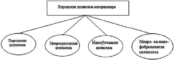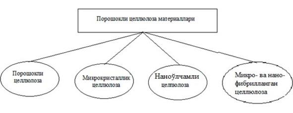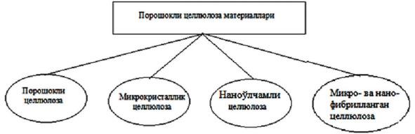 Целлюлоза турлари толали хом ашё ёки целлюлоза олиш усулига қараб номланади. Хом ашё бўйича целлюлоза турлари: пахта, ёғоч, шоли, сомон, каноп кабилар. Целлюлоза олиниш усулларига қараб: сульфатли, натронли, нейтрал, сульфитли кабилар. Булардан ташқари, ишлатиш соҳасига қараб: техник, яримтайёр целлюлоза кабилар. Гидролизга учратилган целлюло- заларни — гидрат целлюлоза, чуқур гидролизга учратганларини — порошокли-,микрокристаллик- ва нано целлюлоза деб юрити- лади. Целлюлоза турлари ҳақида дарслик ва справочникларда кенг ёритилганлиги [9—13] сабабли бу мавзу кенг ёритилмади.