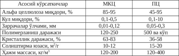 ли кислоталарда ва кўплаб органик эритувчиларда эримайди. Фақат унинг гидроксил гуруҳларининг кўплиги ҳисобига ги- дрофилл ҳисобланади (намланиш бурчаги 20—30°). Целлюлоза ҳидсиз, таъмсиз. Шу сабабли унинг структуравий ўзгарган ми- крокристалл кўриниши — Е460 маркаси озиқ-овқат саноатида қўшимча ўрнида қўлланилади. Целлюлоза кўплаб микроорга- низмлар иштирокида биодегидратацияга учрайди.