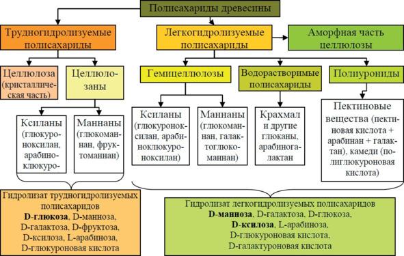 Ёғоч полисахаридларини кислота муҳитида гидролиз- лаш жараёнининг тезлиги иккига бўлинади — осон ва қийин гидролизланувчи. Бу бўлинишга сабаб полисахаридларнинг уст структура тузилишига (надмолекуляр структура) боғ- лиқ. Полисахаридларни суюлтирилган кислота эритмаларида (2—5% НСl, 1000C) гиролизлашда — осон гидролизланувчи; кон- центрланган кислоталарда (70—80% H2SO4 ёки 40—42% НСl, 250C) — қийин гидролизланувчи. Осон гидролизланувчи поли- сахаридларга гемицеллюлоза ва аморф полимерлар киради. Қийин гидролизланувчи полисахаридларга эса целлюлозали гемицеллюлоза, целлюлоза билан кристалланиб қолган пара- кристаллик қисми ва унинг микрофибриллари киради. Қуйида- ги схемада ёғочнинг углеродли қисми ва тўла гидролизланган маҳсулотлари келтирилган.
