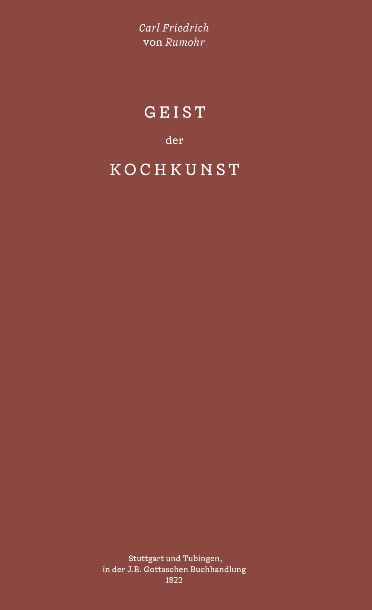 2. Здесь Румор намеренно акцентирует внимание на специфике своего трактата, в котором он сознательно объединяет две совершенно противоположные сферы — сферу духа и материальную сферу. Первая связана с тайной жизнью души и раскрывает творческую природу человека; вторая — с повседневной деятельностью и ремеслом, направленными на удовлетворение телесных потребностей. Некоторые исследователи усматривают в провокационном заглавии Румора отсылку к программному труду эпохи Просвещения — работе Шарля Луи де Монтескье «О духе законов» (фр. De l'esprit des loix, 1748), в которой, в частности, постулируются принципы разделения властей, отмены рабства и развития либерализма. Еще одной подсказкой, проливающей свет на возможные источники вдохновения Румора, может служить само название его книги. Термин der Geist (нем. «дух») непосредственно восходит к работам современника Карла Фридриха фон Румора — Георга Вильгельма Фридриха Гегеля, ключевыми категориями философской системы которого были понятия absoluter Geist (нем. «Абсолютный дух») и Weltgeist (нем. «Мировой дух»), о которых он писал в своих трактатах «Наука логики» (1812–1816) и «Феноменология духа» (1807).