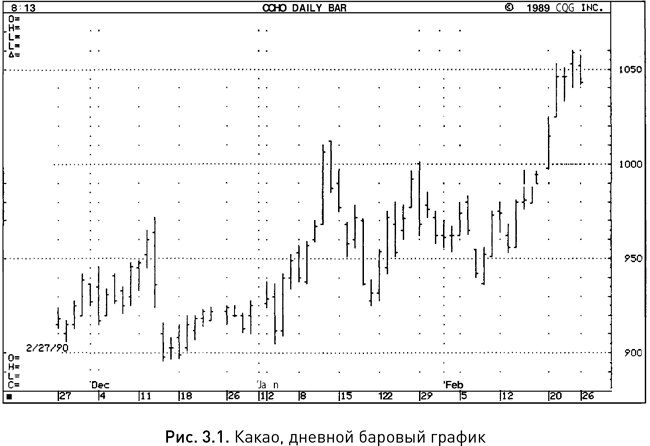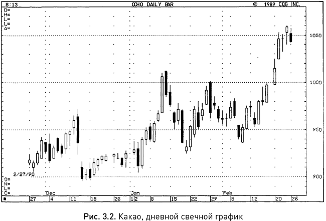Различия между баровым и свечным графиками заметить нетрудно, хотя и тот, и другой содержат одинаковую информацию о ценах. При использовании свечей плоский, двухмерный баровый график как бы становится трехмерным: кажется, будто свечи пытаются покинуть пределы страницы, создавая стереоскопическую картину рынка. Сравните рисунки 3.1 и 3.2 — свечной график явно производит более яркое впечатление.