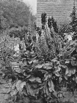 on the garden walls of Italian monasteries. Among the Rosemaries I always like, if possible, to "tickle in" a China Rose or two, the tender pink of the Rose seems to go so well with the dark but dull-surfaced Rosemary. Then still in the wall-border comes a long straggling mass of that very pretty and interesting herbaceous Clematis, C. Davidiana. The colour of its flower always delights me; it is of an unusual kind of greyish-blue, of very tender and lovely quality. It does well in this warm border, growing about three feet high. Then on the wall come Pyrus Maulei and Chimonanthus, Claret-Vine, and the large-flowered Ceanothus Gloire de Versailles, hardy Fuchsia, and Magnolia Soulangeana, ending with a big bush of Choisya ternata, and rambling above it a very fine kind of Bignonia grandiflora.