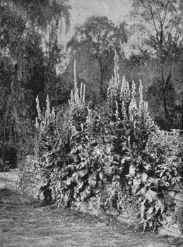 garden plant. It does well in any waste spaces of poor soil, where, by having plants of all ages, there will be some to flower every year. The Mullein moth is sure to find them out, and it behoves the careful gardener to look for and destroy the caterpillars, or he may some day find, instead of his stately Mulleins, tall stems only clothed with unsightly grey rags. The caterpillars are easily caught when quite small or when rather large; but midway in their growth, when three-quarters of an inch long, they are wary, and at the approach of the avenging gardener they will give a sudden wriggling jump, and roll down into the lower depths of the large foliage, where they are difficult to find. But by going round the plants twice a day for about a week they can all be discovered.