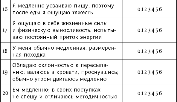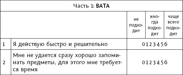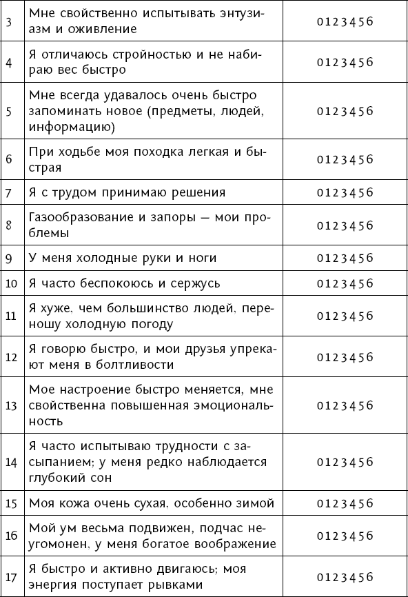 Приведенная далее анкета разделена на три части. Отвечая на первые 20 вопросов, относящиеся к доше вата, внимательно прочитайте каждое утверждение и поставьте цифру от 1 до 6, ориентируясь на то, что вам больше подходит.