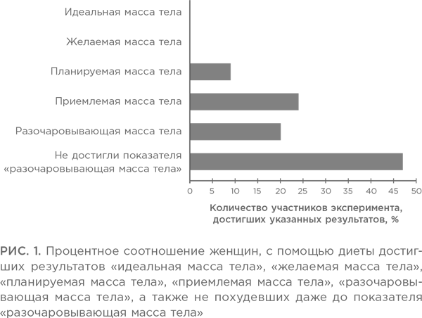 В среднем на момент начала диеты женщины весили около 100 кг и планировали похудеть более чем на 30 кг. Приемлемой они называли потерю 25 кг, а результат, равняющийся 17 кг, разочаровал бы их. В итоге каждая из них похудела примерно на 16 кг, что можно расценивать как достижение. Однако, несмотря на сравнительный успех, мало кто из женщин остался доволен результатом. Как показано на рис. 1, никто из участвовавших в исследовании не достиг значения, который считался идеальным в 1940-х гг. Никто не добился массы тела, о которой мечтал, и только 9% похудели на столько, на сколько планировали; 24% женщин завершили диету с приемлемой массой тела, а 20% — со значением, которое их разочаровало; 47% женщин — почти половина — даже не смогли похудеть до уровня, который бы их разочаровал.