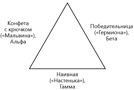 А по углам этого треугольника будут расположены смешанные типы: Мальвина+Гермиона, Гермиона+Настенька, Мальвина+Настенька. Стоит отметить, что наибольших высот в карьере чаще всего достигают девушки, относящиеся к верхнему углу треугольника, сочетающие в себе черты Мальвины и Гермионы. Им же труднее всего найти партнера. Они же все могут сами! А чтобы уважать партнера, который им подчиняется или в чем-то им уступает, нужна мудрость, которая приходит с годами.