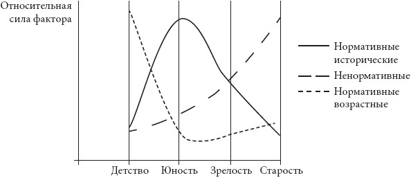 П. Балтес [Крайг, 2000] полагает, что в развитии индивида на протяжении жизни взаимодействуют три типа факторов. Нормативные возрастные факторы– это те биологические (пубертат, менопауза, физические аспекты старения) и социальные (поступление в школу, вступление в брак, уход на пенсию и др.) изменения, которые обычно происходят в определенном, предсказуемом возрасте. Нормативные исторические факторы– это такие исторические события, которые практически одновременно затрагивают всю возрастную когорту (война, экономический спад, эпидемия). Ненормативные факторы– это сугубо личные события, перемены в жизни человека, которые не связаны с определенным возрастным периодом (изменения в карьере, болезнь, развод и др.). С этой точки зрения, развитие обусловлено тремя взаимодействующими факторами: нормативными возрастными, нормативными историческими и ненормативными. Сила воздействия этих факторов может различаться в зависимости от возраста человека. Дети и старики зачастую больше подвержены влиянию нормативных возрастных факторов. В период юности и ранней взрослости большее влияние приобретают нормативные исторические факторы. Накопленный эффект случайных ненормативных событий нередко приобретает особое значение для пожилых людей. На рис. 1.1 показано взаимодействие этих факторов в разные периоды жизни людей [Там же, с. 29].