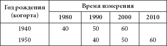 Лонгитюдный план, а также план поперечных срезов и план с временным лагом называют «простыми» [Там же]. Их недостатки привели к разработке более сложных исследовательских планов, представляющих собой различные варианты последовательныхили комбинированных планов, соединяющих в себе элементы «простых» планов и позволяющих дать больше информации, а главное – разграничить эффекты возраста, поколения и времени измерения. Примером таких исследовательских подходов являются план последовательности когорт, состоящий из двух (или более) накладывающихся друг на друга лонгитюдных исследований, и план последовательности времени, который включает в себя два (или более) исследования методом поперечных срезов, производимых в разное время (табл. 1.2 и 1.3) [Миллер, 2002, с. 58].