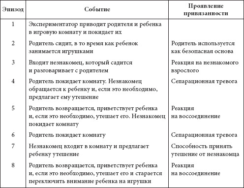 По мнению Боулби, именно качество устанавливаемых отношений с матерью или лицом, ее заменяющим, имеет ключевое значение для формирующегося у ребенка качества привязанности. М. Эйнсворт, последовательница и коллега Д. Боулби, предложила стандартную процедуру измерения качества привязанности между матерью и младенцем. Это методика «Незнакомая ситуация», которая составляет последовательность из восьми эпизодов (см. табл. 2.1) [Берк, 2006, с. 665].