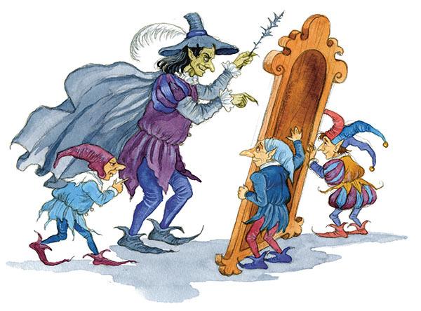 Жил-был тролль, злой-презлой – сущий дьявол! Как-то раз он был в особенно хорошем настроении, потому что смастерил зеркало, отражаясь в котором, всё доброе и прекрасное почти исчезало, а всё плохое и безобразное, напротив, бросалось в глаза и казалось ещё отвратительней. Красивейшие виды, отразившись в нём, казались варёным шпинатом, а лучшие из людей – уродами; или же чудилось, будто люди эти стоят вверх ногами, а живота у них вовсе нет! Лица в этом зеркале искажались до того, что их нельзя было узнать, а если у кого на лице сидела веснушка, она расплывалась во весь нос или щёку. Тролля всё это очень потешало. Когда человеку приходила в голову добрая, хорошая мысль, зеркало тотчас строило рожу, а тролль не мог удержаться от хохота, так он радовался своей забавной выдумке. Ученики тролля – а у него была своя школа – рассказывали о зеркале как о каком-то чуде.