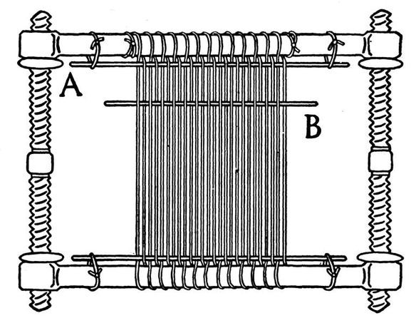 way in which the wefts may be interlocked whilst the weaving goes on. Examination of the drawing will probably be sufficient explanation; however, interlocking is effected thus: Commencing at the base, run a weft of the darker wool to and fro, leaving it slack at the turning point. A half pass of the lighter-coloured woof is then run through, it is threaded in an upward direction through the slack loop of the darker wool, waits there whilst another weft of the darker colour is worked, and then is threaded down through the second loop that has been formed, and returns to the starting-point. It then comes back again and is threaded upwards through this same loop, and waits, as before, for another to be formed, and