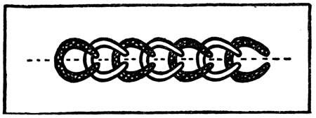 until the thread has to be placed under the point of the needle for forming the loop. Place only one of the two threads underneath, leaving the other on one side out of the way, then draw the needle and thread through over the one held down. A chain stitch will have been formed with the thread that was looped under the needle. For the next stitch, the alternate thread is placed under, and so on, taking each thread in turn. The thread not in use each time usually requires a little adjustment to make it entirely disappear from the surface.