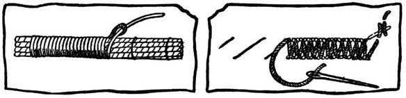 in buttonholing, the working edge in this case being away from the worker. Let the worker, having reached the point of pulling the thread through to complete the stitch, draw it out in the direction away from her. This will draw the stitch towards the edge, where it will form a knot. In the diagram one of the stitches has been partly undone in order to show the working more clearly. When the two sides are bound with the stitch, they can be laced together with another thread as in the illustration.