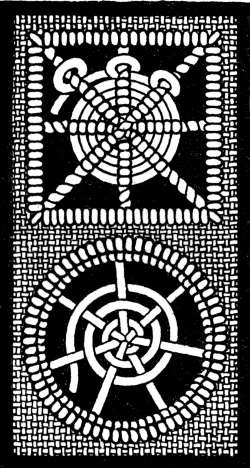 the needle up beyond the next bar. It then takes the thread a step back and over the same bar and brings it up beyond the next; this goes on until the circle is of sufficient size, the stitches growing a little longer in each succeeding row. In the diagram the thread is loosened at the end to explain the working. The lower example is a commonly used wheel, which is made by the thread running round alternately over and under a bar until the wheel is completed. It should be as solid as the upper one, but is purposely left loose in the diagram. Either of the wheels could have a line of buttonhole stitching worked round the edge as a finish. This figure shows also the two usual ways of making firm the raw edges in cut work—the square shape is bound by an overcast stitch, and the round one by buttonholing.