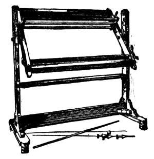 is the link that keeps the frame together, for the screw ends fit just loosely in the holes of the rollers. The side pieces are sometimes made of flat laths of wood pierced with holes at regular intervals; in these are inserted metal pins, by means of which the work is kept stretched.