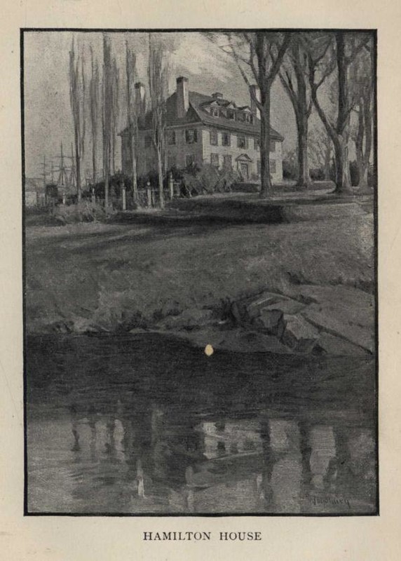 The broad green fields of Hamilton's estate climbed a long hill behind the house, hedged in by stately rows of elms and tufted by young orchards; at the western side a strong mountain stream came down its deep channel over noisy falls and rapids to meet the salt tide in the bay below. This broad sea inlet and inland harborage was too well filled in an anxious year with freightless vessels both small and great: heavy seagoing craft and lateen-sailed gundalows for the river traffic; idle enough now, and careened on the mud at half tide in picturesque confusion.
