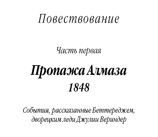 — Как вам известно, пропажа алмаза бросила тень подозрения на репутацию невинных людей. Память невинных может пострадать и впоследствии, по недостатку письменных фактов, к которым могли бы прибегнуть те, кто будет жить после нас. Нет сомнения, что эта наша странная семейная история стоит того, чтобы о ней рассказать, и мне кажется, Беттередж, мы с адвокатом придумали правильный способ, как это сделать.