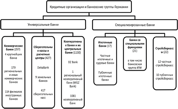 Таким образом, отличительной особенностью современной банковской системы Германии является наличие в ней «трех колонн», как выражаются германские юристы: системы учреждений публичного права (земельные банки и сберегательные кассы), кооперативных банков, включая их центральные организации, а также коммерческих банков.