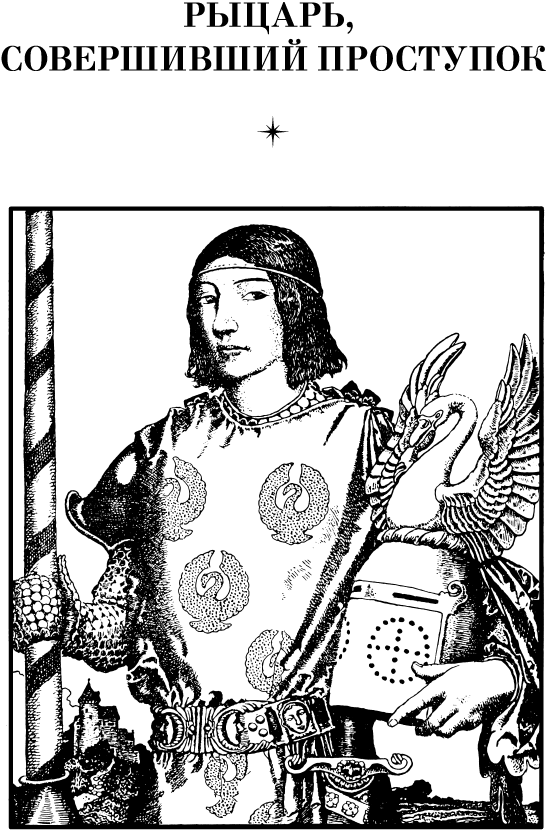 Они выехали на лесную прогалину с небольшим потоком посередине. Тут находился брод, и поток бежал, позванивая, по чистым камням, лежавшим на глубине всего в несколько дюймов. Солнце заливало прогалину, ворковали сонные вяхири, а по другую сторону певучего тока возвышался огромный рыцарь в черных доспехах и низко надвинутом турнирном шлеме. Щит его обтягивала парусина, он неподвижно восседал на черном коне. Прочитать его герб никакой возможности не было. Неподвижный, осанистый в своей железной оболочке, с огромным слепым шлемом на голове, лишавшим его лица, он выглядел очень грозно. Невозможно было понять, о чем он думает и что собирается предпринять. Он казался воплощенной опасностью.