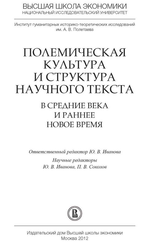 П49 Полемическая культура и структура научного текста в Средние века и раннее Новое время: коллект. моногр. / отв. ред. Ю. В. Иванова; науч. ред. Ю. В. Иванова, П. В. Соколов; сост. указателя М. В. Шумилин; Нац. исслед. ун-т «Высшая школа экономики». — М.: Изд. дом Высшей школы экономики, 2012. — ISBN 978-5-7598-0894-7 (в пер.).