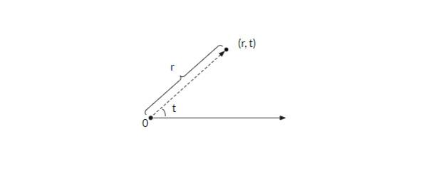 В полярной системе координат точки будем обозначать парой (r, t). Где r — это расстояние от точки О, называемой полюсом, а t — угол между горизонтальным лучом, исходящим из полюса, направленным вправо, и радиусом-вектором, указывающим на точку (рис. 1.3).