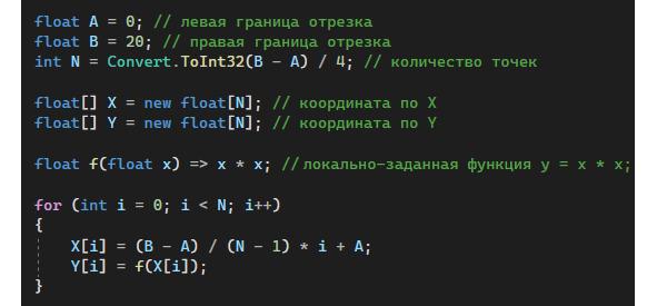 Код достаточно простой, но поскольку мы с вами находимся в начале пути, немного комментариев к нему не будут лишними. Во-первых, в коде присутствуют границы отрезка, на котором мы собираемся строим наш график — это A и B. Во-вторых, сама функция f (x) задана локально и в нашем случае это y=x2. От исходной функции требуется, чтобы она была определена при всех значениях внутри заданного отрезка. Очевидно, что наша функция этому условию удовлетворяет. Далее, N — это число точек для построения. На самом деле выбор этого значения — сама по себе весьма интересная задача. От выбора числа N зависит, как будет выглядеть наш график. Понятно, что нет смысла брать слишком много точек, поскольку разрешение экрана конечно. С другой стороны, точек не может быть мало, иначе график будет угловатым и не будет отображать истинное поведение функции. Обратите внимание на формулу для вычисления X [i]. При i=0, X [i] =A, а при i=N-1 (максимальной значение i в цикле), мы получаем X [i] =B. Поскольку формула для X [i] линейна относительно i, значит в массиве X будут лежать значения от A до B с равномерным шагом.