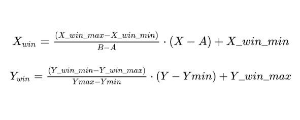Теперь, когда у нас все готово, приведем формулы преобразования точек из обычной системы координат в компьютерную.