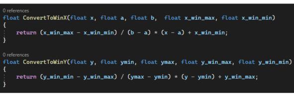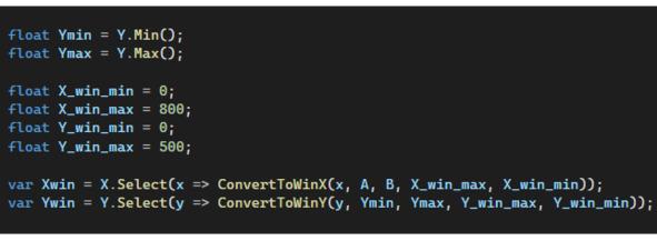 Сама конвертация выглядит так, как показано на листинге ниже. В данном коде мы воспользовались функционалом, который предоставляет нам System.Linq для поиска минимального и максимального значений в массиве Y, а также для самой конвертации.