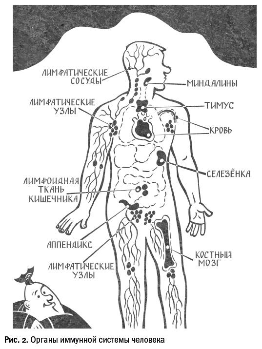За защиту нашего организма от вторжения нежелательных «гостей» отвечают клетки иммунной системы — лейкоциты. Многообразие видов и функций этих клеток обеспечивает разнообразие и гибкость иммунного ответа. Границы между органами очевидны. Домохозяйка, разделывающая кролика или курицу, легко отличит печенку от легких, почки от желудка, но нет такого места в организме, про которое можно было бы сказать: здесь находится иммунитет. Иммунная система «пропитывает» все наше тело подобно тому, как сироп пропитывает ромовую бабу. Лейкоциты присутствуют везде: в коже, стенках кишечника, легких. Они путешествуют с током крови, но имеют и собственную транспортную сеть — лимфатические сосуды.