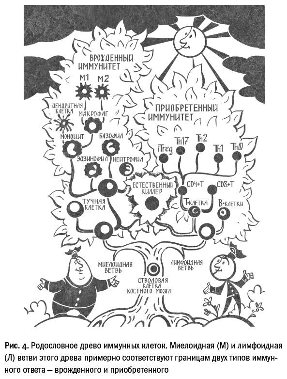М-клетки подобны заслуженным полицейским-универсалам, работающим по старинке; Л-клетки — молодые эксперты, блестяще решающие узкоспециальные задачи, но за их границами беспомощные, как любой обыватель. Возрастные метафоры здесь не случайны: в эволюционном смысле М-клетки древнее Л-клеток. Миелоидные клетки обеспечивают базовый, врожденный иммунитет, который в том или ином виде присущ всем многоклеточным животным. Лимфоидные клетки отвечают за более тонкие и специфические защитные реакции, получившие название приобретенного, или адаптивного, иммунитета. Однако как молодому амбициозному детективу редко удается добиться успеха без помощи пусть немного старомодного, но опытного и знающего жизнь коллеги, так и Л-клетки нуждаются в М-клетках для выполнения своих функций.