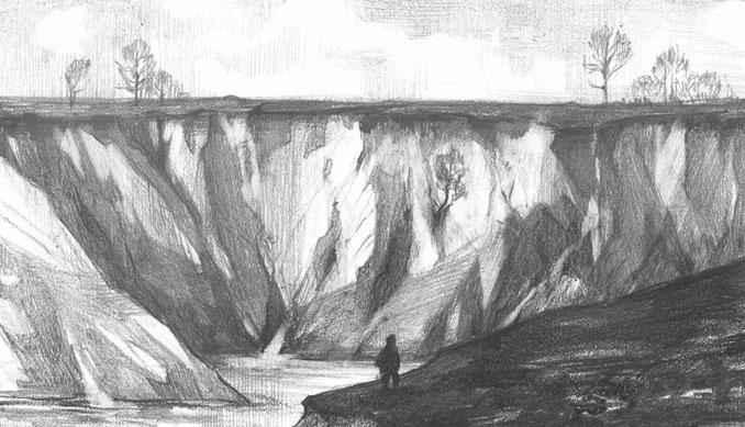 Ещё издали Петя услышал весёлый шум. Подошёл ближе и увидел, что водопады грохочут в каждом овраге… И какие высокие — не меньше трёх саженей3! Мутновато-серые потоки обрушивались с высоты, поднимая пенные брызги, закручиваясь, перепрыгивая друг через друга… Петя полюбовался ими и последовал за течением. Вскоре он обнаружил, что вода действительно соединяется в общее русло, проходит по огромным камням, как по порогам, и утихает, превратившись в широкое прозрачное зеркало.