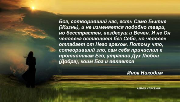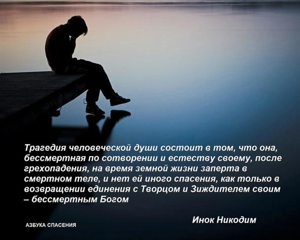 Трагедия человеческой души состоит в том, что она, бессмертная по сотворению и естеству своему, после грехопадения праотцев, на время земной жизни, заперта в смертном теле, и нет ей иного выхода (спасения), как только восстановления утраченного единения с Творцом и Зиждителем своим — Богом (Отцом). Инок Никодим