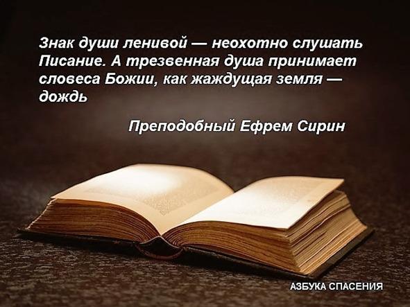 Знак души ленивой — неохотно слушать Писание. А трезвенная душа принимает словеса Божии, как жаждущая земля — дождь.