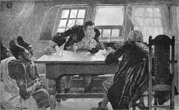 I presently led the way to my cabin, the chiefs following close at our heels, and Mr. Longways walking beside me, grimacing like a little old monkey in a vastly affected manner. Nor could I forbear smiling to see how he directed his observations towards the ladies, and more especially Mistress Pamela, who stood at the rail of the deck above. Mr. Longways carried in his hand a strong iron despatch-box, about the bigness of those used by the runners at the Bank, and so soon as we had come into my cabin he clapped it down upon the table with a great noise.