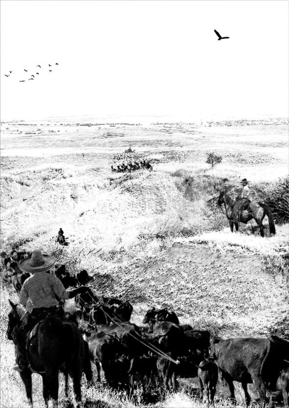 Коровы были сбиты десятком ловких ковбоев в плотную длинную ленту, и это не могло не привлекать внимания. Особенно тех, кто сам никогда не принимал участия в нечто подобном. Сам Боб ехал в чаквагоне (4), одновременно исполняя роль руководителя перехода, возницы и повара. Может быть потому, что неплохо готовил, может, экономил на зарплате или не нашел подходящего человека, а может из-за того, что его старые кости больше не хотели радоваться верховой езде во время долгого перехода. Так или иначе, повар всегда считался самым ценным членом ковбойской бригады. В отличие от многих одиночек, предпочитавших жизнь на уединенном ранчо, Боб был веселым и добродушным человеком, достаточно повидавшем на своем веку, но, при этом, не утратившим радости жизни. Завидев соседей, старик приветственно махнул им рукой, что несколько смутило Иеремию. Он не знал, то ли ответить на приветствие, то ли сделать вид, что не заметил, поэтому его рука вяло махнула в ответ, вроде бы отгоняя навязчивую муху, и молчаливый переселенец предпочел вернуться к работе. Оно и правда, день обещал быть жарким, а работы невпроворот. Земли, вроде бы, и свободные, но пока ты не построил дом, и не обзавелся стадом, прав на них не имеешь. А конкуренты не дремлют, недаром к востоку и южнее реки ранчо росли как грибы.