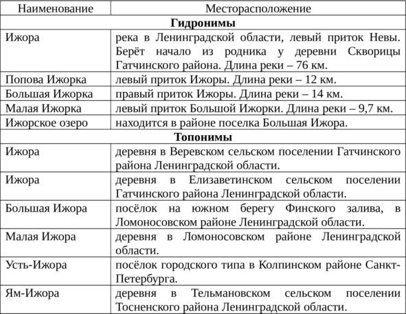 От названия реки Ижора образован целый ряд гидронимов и топонимов, которые представлены в табл. 1.