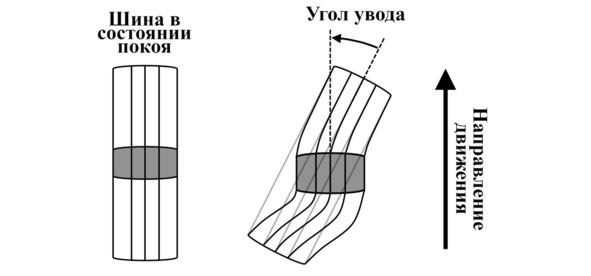 На рисунке схематично изображена деформация шины при сносе передней оси, когда передние колёса повёрнуты рулём на большой угол. Пятно контакта закрашено серым цветом. При торможении нагрузка на переднюю ось увеличивается, поэтому увеличивается и площадь пятна контакта. При сносе передней оси происходит деформация шины, пятно контакта поворачивается в сторону направления движения, возникает так называемый увод резины. Увод резины — это угол скручивания пятна контакта относительно направления движения колеса. Коэффициент поворачиваемости определяется как отношение увода резины задних колёс к уводу резины передних колёс. Если увод передних шин превосходит увод задних шин, то коэффициент поворачиваемости меньше единицы. В этом случае говорят, что поворачиваемость недостаточная.