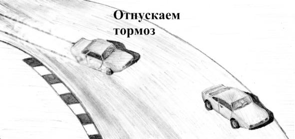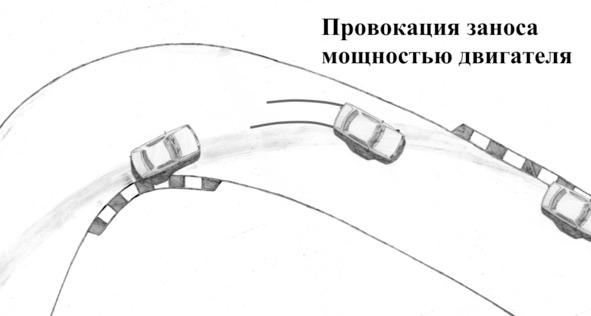б) Возникающий на выходе из поворота небольшой снос передней оси можно погасить резким нажатием на педаль газа (приём только для заднеприводного автомобиля, нужен достаточно высокий крутящий момент двигателя).