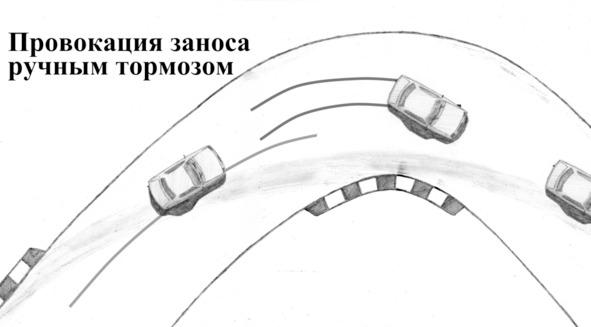 а) Занос задней оси можно спровоцировать при помощи ручного тормоза. После возникновения заноса нужно повернуть руль против направления заноса (против направления поворота), чтобы машину не развернуло. После того, как скорость движения упадёт, восстанавливаем траекторию.