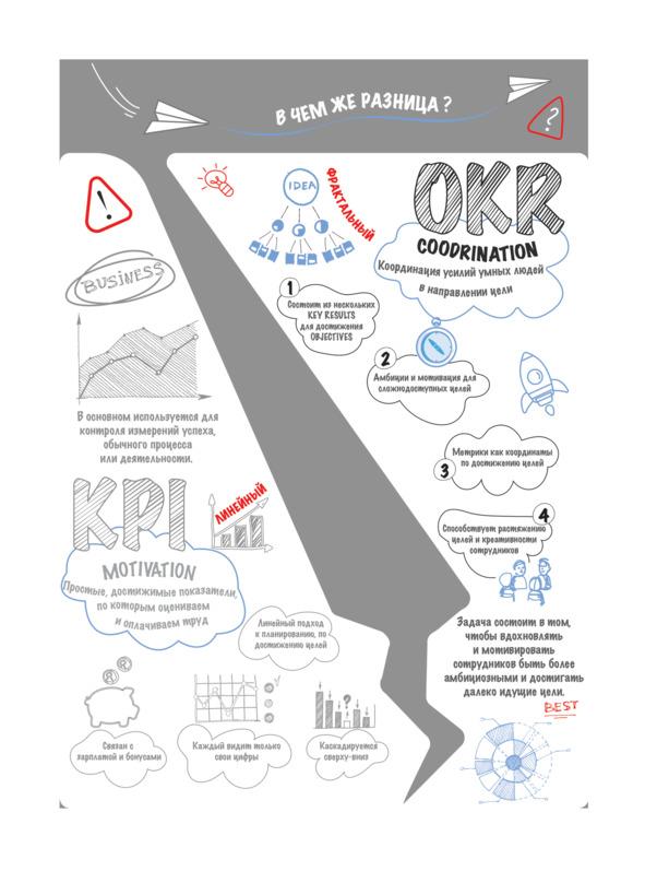 • по KPI проводят срезы раз в месяц или раз в год, так как они влияют на материальное вознаграждение сотрудников. Поэтому срезы проводят перед выплатой заработной платы, бонусов и премий. Таким образом, если они влияют на годовой бонус, срез проводится раз в год, если на месячный, то раз в месяц (чаще всего привязан к зарплате). В случае OKR срез проводят раз в две недели и раз в квартал. KPI ставятся на год, и каждый месяц проводится замер — что и как в этом месяце происходит в рамках проекта. OKR ставятся на квартал, и каждые две недели внутри этого квартала проводится замер данных. То есть больший ритм; сверки проходят чаще. Для чего так часто делать срезы и сверки? К чему такой ритм? Данная частота дает гибкость и динамичность. Вы прекрасно понимаете, что, поставив цель на год, через два-три месяца можно обнаружить изменения рынка. А через квартал или два — это будет совершенно другой рынок, а значит, необходимы другие цели. Тогда вопрос: зачем мы их вообще ставили? Ответ прост: OKR дает возможность корректировать направление нашего движения к нашим целям без привязки к зарплате.