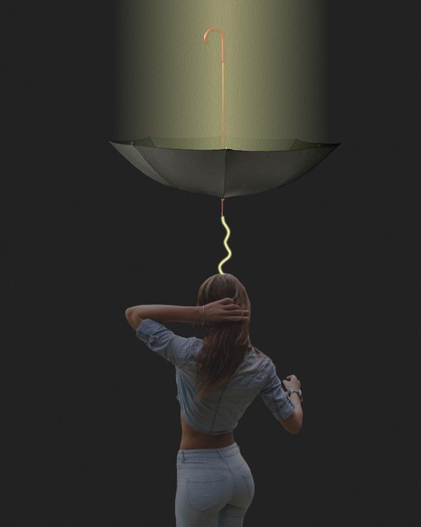 Я увидела себя со стороны, стоящей в невесомости без пола и стен на фоне серого цвета бесконечного пространства. Над моей головой находился зонт чёрного цвета, его ручка была сделана из гладкого дерева в виде трости с текстурой полированного, покрытого лаком вяза. Конец трости был классически завёрнут в полукруг, спицы зонта выглядели металлическими, я бы даже сказала хромированными, а на конце красовались заклёпки, также выполненные в классической форме. Зонт был раскрыт, но повёрнут тростью вверх, и его колпачок, то острие, соединяющее спицы в центре, смотрел ровно на мою голову, не дотягиваясь до неё сантиметров тридцать. Над зонтом стоял столб льющегося света — это была плотная материя переливающихся волокон жёлтой светящейся массы. Такая же масса, только тонким потоком, выходила из острия колпачка, соединяющего спицы на наружной части зонта, и уходила прямо в мою голову в центре черепа, в область темечка.