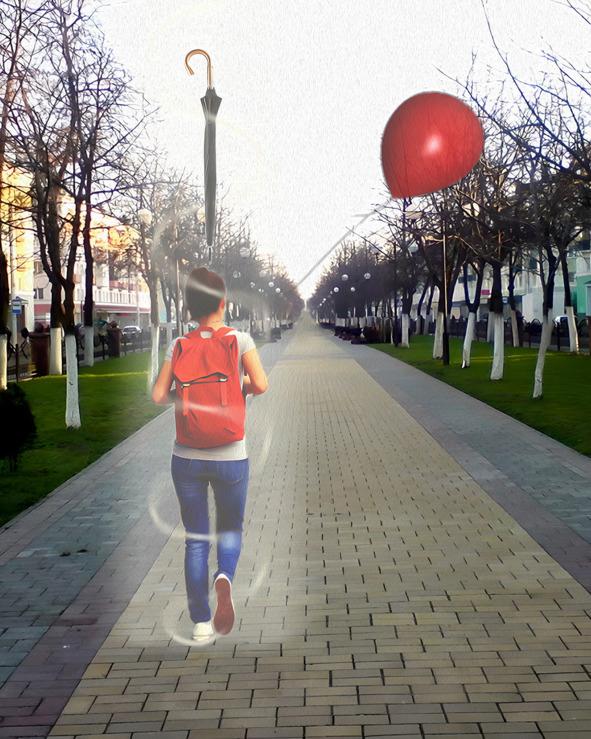 Свернув на второстепенную пешеходную улочку, я вдруг поняла, что вижу себя идущей по улице как бы со стороны. Ракурс был со спины и чуть выше. Я смотрела на себя как привязанный сзади на верёвочке шарик. Причём это было своего рода двойное зрение. Описать его сложно, но я одновременно видела и дорогу своими глазами и себя сверху — глазами привязанного шарика. Над моей головой находился всё тот же зонт, перевёрнутый вверх тростью, но на этот раз он был сложен и просто висел в центре потока ярких волокон, которые падали и на мои плечи в том числе. Так продолжалось минут пять. Я шла по дороге и видела себя в двух проекциях одновременно.
