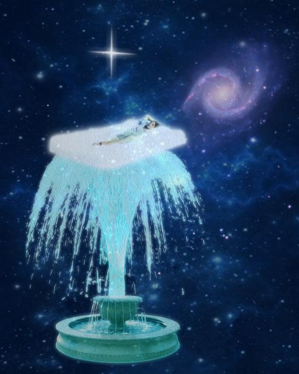Я увидела в центре стоящий фонтан, но вместо воды в нём была жидкость жёлто-белого цвета, а на гребне струи воды, поднимающейся вверх, красовалась прямоугольная платформа, на которой лежала я.
