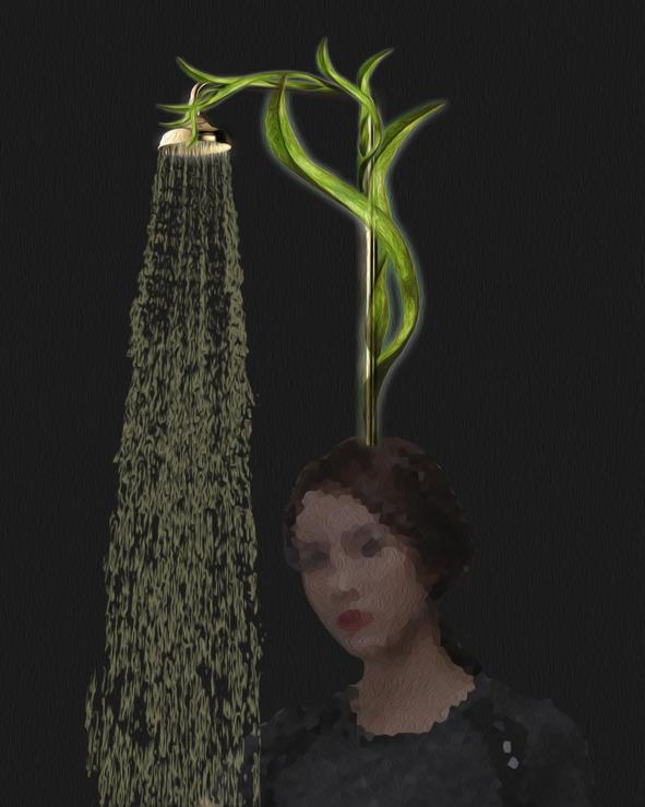 Передо мной появился образ душа, стоящего на металлической стойке. Основание его входило мне в голову чуть выше родничка. Во время вопроса из головы спиралью вверх по стойке начал закручиваться поток, состоящий из плотной зелёной материи. Он поднялся вверх в сеточку душа, и из неё начала литься вода. Она просто лилась, причём не на меня, а как бы чуть впереди, и светилась жёлтым светом.