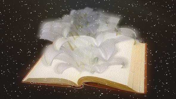 Появилось такое ощущение, что процесс раскрытия будет бесконечным. Каждый раз, когда лепестки цветка дотрагивались до горизонта в его центре, вновь формировался новый бутон, который точно так же начинал открываться дальше, и этот процесс длился и длился. Когда лепестки касались воображаемой горизонтальной линии, они превращались в листы книги в толстом переплёте и становились единым целым с открытыми страницами. Этот процесс не останавливался. Лилия всё раскрывалась и раскрывалась, образуя новые страницы, на краях которых появлялись золотые искры. Они разлетались, как бы осыпаясь вокруг, и продолжали светиться яркими огоньками.