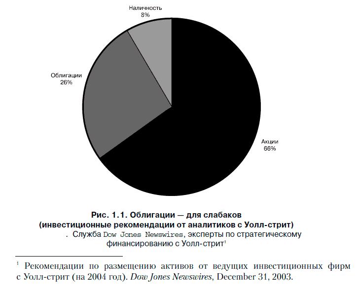 Адам работает в известном инвестиционном банке на Уоллстрит. Если бы молодой человек обратился за советом к аналитикам с этой улицы (одного из мировых финансовых центров) относительно того, во что инвестировать свободные средства, он получил бы простой совет: покупать акции. Диаграмма на рис. 1.1 отражает согласованные рекомендации ведущих инвестиционных компаний Уолл-стрит.